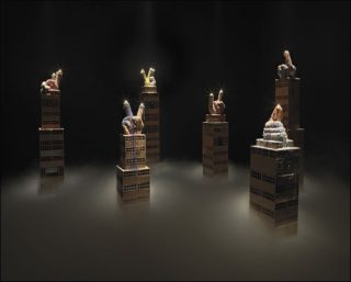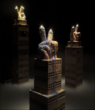 Initialement conçues pour le Swiss Institute de New York, ces sculptures évoquent les buildings de la ville américaine et se présentent comme des remakes de la Statue de la Liberté. A l’extrémité des doigts tendus brûlent des bougies, reprises de la torche du fameux édifice, ces sculptures constituent alors six propositions de monuments emblématiques pour des villes utopiques.