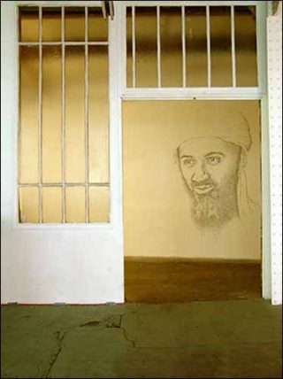 Ainsi du visage immédiatement identifiable de Ben Laden qui envahit tout un mur de La Générale de son regard paisible et impressionnant. Dans cette œuvre éphémère d’Elodie Huet intitulée Dead or Alive, le visage est uniquement composé d’empreintes d’un tampon encreur daté du 11 septembre 2001.