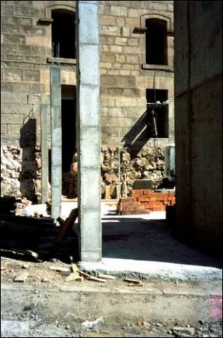 «L’entre-temps» est le terme choisi pour qualifier celui que Valérie Jouve feint de fixer sur la pellicule. Ces chantiers urbains, terrains vagues, fenêtres murées, palissades, dalles de béton, sont autant de paysages de désolation que de territoires de tous les possibles. La lenteur des procédures de réhabilitation s’y éprouve en même temps que point le pressentiment de l’imminence. L’attente paradoxale, de leur sort ou du bon moment pour agir, contamine chacun des personnages dans ce corpus volontairement dépeuplé; leur mélancolie en captivité (toujours entourés de murs ou de grilles) retient sous pression leur velléité de révolte, ou de fuite, que seul un adolescent amorce en enjambant une barrière — achèvera-t-il son geste? (Les Personnages 1998/1999).