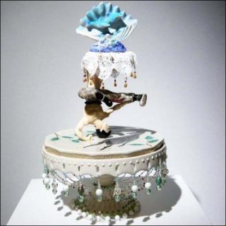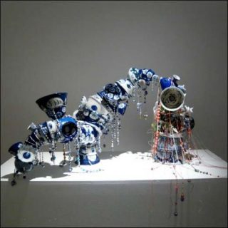 Skall assemble plus qu’il ne sculpte, usant des objets comme autant d’éléments capables de réinventer leur sens et leur forme pour se combiner à l’infini. Parfois la composition est simple: un grand pan de verre coloré au bout duquel est fixée une vasque en poterie. Mais à côté de ces pièces aux formes épurées, ce sont les complexes compositions aux accents kitsch et outranciers comme A Light Beyond Darkness, qui attirent l’œil. Leur réalisation peut demander deux à trois ans de travail à l’artiste. Là , c’est l’accumulation qui fascine. Non pas par le sentiment de chaos qu’elle suscite mais, au contraire, par son ordre structuré qui apporte rythme et densité à la forme.