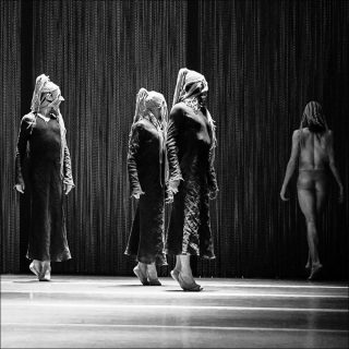 Vêtus de longues robes noires et visages voilés, les danseurs marchent lentement au rythme de sons de tirs réguliers qui évoquent un état de guerre. Lorsque tombent les robes noires, les danseurs ne sont plus vêtus que de fins sous-vêtements de couleur terre presque transparents et coiffés de masques de cordes tombant sur leurs épaules. Des temps ancestraux semblent alors resurgir, conduisant à se remémorer l’inévitable lutte pour la vie et les conflits tribaux. Les corps se raidissent et se déchaînent, le territoire doit être défendu, l’espace conquis.