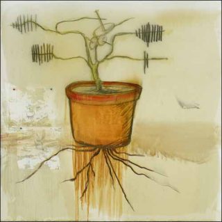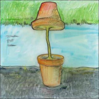 Fabrice Hyber. C’est exactement ça. Toute l’exposition est condensée dedans. Il y a les personnages curatifs, les pots de plantes qui peuvent signifier l’impossibilité à vivre, les vers de terre qui meurent, les robots qui aboutissent à la guerre, les plantes qui grandissent ou meurent, celles qui sont calcinées. Ici sont présentées et résumées toutes les inquiétudes du quotidien.