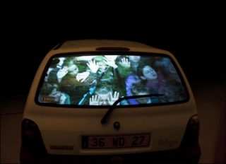 L’art vidéo joue un rôle primordial dans sa pratique, notamment l’utilisation de systèmes de projections dans l’espace ou directement sur des objets sélectionnés. Celles-ci viennent animer des scènes initialement immobiles. Ainsi sur la fenêtre arrière d’une voiture est projetée l’image d’une groupe d’enfants qui, comme pris au piège du véhicule, crient, se débattent et semblent frapper sur la vitre.