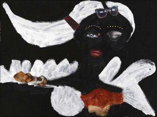 Plus abrupte encore est la peinture de l’afro-américaine Warsame Uman, transgenre et auteur de la série TWOC (Trans Women Of Color) : elle utilise la parodie pour dénoncer. Ses Å“uvres sont une démonstration par l’absurde et le burlesque. Le noir profond, le blanc tranchant, les couleurs feraient presque oublier les collages d’yeux et de bouche, fondus dans la superposition des matières et des identités.