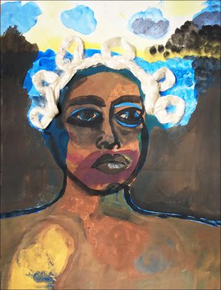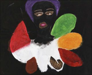 Les visages aux yeux agrandis, les vifs contrastes du maquillage, la fixité des masques dégagent une impression de vie étrange, arrêtée et magnifiée. L’artiste togolaise Atsoupé fait vibrer le bleu de Prusse, le rouge carmin, le vert de jade, dans des feux de joie qui prennent figure humaine, et interrogent le spectateur.