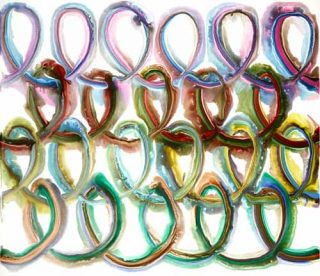 Entre arabesque et circonvolution, les pirouettes du tracé laissent des sillons creusés par la couleur. L’encre qui se dégage de ces rigoles donne au tableau un aspect à suivre, un aspect de jeu de l’oie dans lequel doit plonger le spectateur.