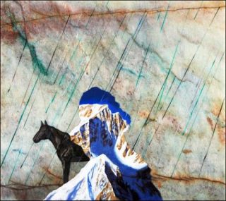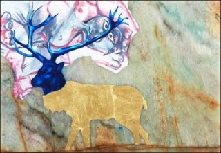 Sur quatre d’entre eux, on retrouve la figure d’un cerf dont le corps est matérialisé à la feuille d’or — les uns confrontés à un fragment de montagne enneigée, un autre semble protéger de ces bois bleus outremer un nu tardif de Picasso, un autre encore arbore fièrement au dessus de sa tête rouge des branches de rosier en guise de bois.