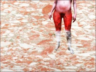 Une vanité figure sur un marbre moucheté de rouge: un crâne violet fait face à une branche d’olivier qui donne l’impression en raison de la transparence (exécution à l’aérographe) d’être inscrit dans la mémoire de la pierre. Pour compléter la série, un petit marbre format carte postale avec un visage rouge qui apparaît dans un coin tel une anamorphose, ou encore, un thème plus noble: une femme au bain, comme effrayée par son reflet dans le marbre rose, qui cache son visage.