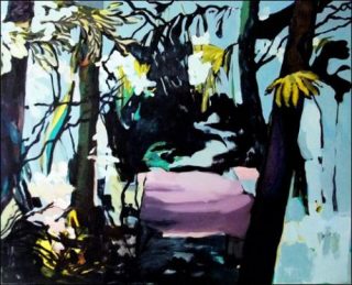 Marion Davout peint des forêts vertigineuses par-dessus des murs et des ruines, des escaliers disparus, des rambardes affaissées ou partielles. Puis des feuillages, des palmes ou des bouquets troubles de feuilles, des plantes épiphytes.