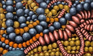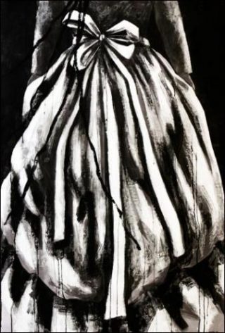 Viennent alors les œuvres d’Emilie Bazus et ses personnages en fuite, courant vers des bals abandonnés, tournant le dos pour plonger dans l’intrigue. Elle nous propose une vision de la figure fragmentée, anonyme, insaisissable; des gros plans, cadrages serrés, morceaux d’étoffes et de corps, de colliers grouillants et chatoyants, d’ornements rituels. Ces gros plans deviennent à leur tour paysages abstraits, histoires inachevées qui nous questionnent sur le merveilleux et l’inquiétant.