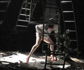 Cette pièce est un grand chant pour moi. Tout passe par sa musicalité, le souffle est en son cœur. C’est un élan fort. Il y a des traitements de voix, la voix nue aussi et une basse-continue qui est le sol de ce lieu, un lieu défini par une structure de métal, inspirée des œuvres sculpturales de Louise Bourgeois. Cette installation crée son propre territoire, un espace autre que celui de la scène. Des éléments de La Vanité se sont placés durant la création, le crâne au témoignage discret, des feuilles qui ne se fanent pas finalement, moi même, une femme-mouche, la terre.