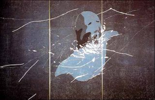 Une immense gravure marouflée sur papier représente un visage solitaire émergeant d’une mer houleuse. On ne sait s’il surnage ou s’il se noie dans cet océan qu’aucune ligne d’horizon ne limite. Les couleurs employés pour le traitement du visage, similaires à celles du fond renforcent cette impression.