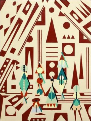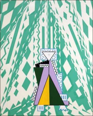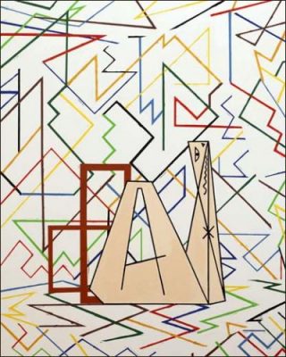 Chaque toile est construite autour d’un dialogue entre le fond et un objet ou une figure situés en premier plan. Le fond est constitué de formes géométriques simples répétées et déployées sur l’ensemble de la surface de la toile. Sur ce motif décliné en all-over se détache une autre forme d’inspiration cubiste. Les arrières et premiers plans croisent leurs lignes géométriques dans une confrontation qui perturbe la vision.