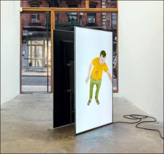 Cette dépossession de soi est d’autant plus présente dans Antoine Office et Antoine Casual. Pour réaliser ces deux vidéos, Artie Vierkant applique au fichier 3D numérique des animations toute prêtes de mouvements humains simplifiés acquises en ligne. Antoine est ainsi l’auteur d’étranges chorégraphies qui semblent lui échapper. Ces deux vidéos troublent par une oscillation permanente entre réalisme et fantastique. Par ailleurs, les tenues vestimentaires arborées par Antoine, qu’elle soit de travail ou décontractée, répondent à des conventions et des stéréotypes sociaux. Enfin le passage de l’image 2D à l’image 3D est évoqué ici de manière elliptique par des incrustations de découpes noires en arrière plan. Antoine Office et Antoine Casual nous interrogent à la fois sur le contrôle de l’autre et le champ des possibles offerts par les nouvelles technologies.