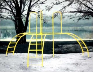 Il en va ainsi de Témoin, un square composé d’aplats de couleur bleue, noire et marron d’où ressort nettement une structure en fer jaune vif. Le souvenir d’enfance s’est focalisé sur ce jeu d’agilité désormais immergé dans un bain de sensations colorées.