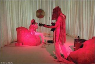 Claudia Triozzi a débuté son propre travail autour de la relation corps / objets et des stéréotypes féminins, collaborant en parallèle à des projets menés par d’autres artistes comme Alain Buffard. Créée au printemps 2002, The Family Tree porte sur les rapports entre voix et musique. En duo avec un guitariste, c’est une pièce délirante ourlée de jeux de mots, de vocalises et de visions. Dans un espace en creux cerné de rideaux blancs, agrémenté de projections d’images, délires intimes et figures ectoplasmiques circulent en toute confidence. Une pièce drôle et surprenante dont ces images gardent la trace.
