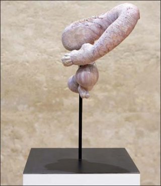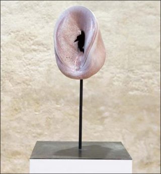 L’artiste présente également une nouvelle série réalisée à partir de pièces tournées, soit parcourues d’un sillon dynamique, comme une onde. Les analogies affluent: ces fragments évoquent pêle-mêle un sein, un coquillage (conque ou cauris), une gueule ou un masque, ou encore un sexe de femme aux lèvres ourlées. Parfois, une petite forme se greffe, telle une vénus préhistorique. A nouveau le corps est rêvé, traversé de visions charnelles: Elsa Sahal adopte la même approche primaire et véhémente pour trouver l’évidence du matériau, sa plasticité naturelle propre à incarner d’inédites métamorphoses. «La terre est un matériau très versatile, qui peut aller du côté de l’abject, comme du sublime et de la délectation. Un matériau qui fait le grand écart», dit-elle.