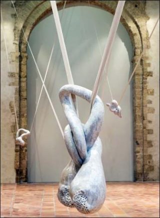 Suspendues avec des sangles, les céramiques de la série «Léda» descendent du plafond de la chapelle, un vol lourd organisé en lignes brisées, diagonales et obliques qui exploite la verticalité des lieux. «J’étire mon pain de terre en grandes plaques que je modèle. Je construis mes volumes comme des patrons de vêtement, je travaille toujours autour du vide. J’aime la sensation que la sculpture pousse de l’intérieur».