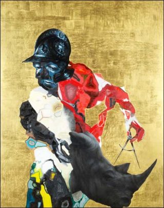— Chevalier mesurant un rhinocéros, 2008 (n° 31). Huile, acrylique et feuille d’or sur bois, 155 x 122 cm