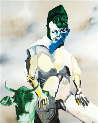 — Personnage avec tête de vache négatif et heaume milanais, 2008 (n°29). Huile, acrylique et feuille d’or sur bois, 155 x 122 cm