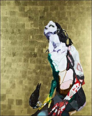 — Nu (Aurélie) avec un busard, 2008 (n°32). Huile, acrylique et feuille d’or sur bois, 155 x 122 cm