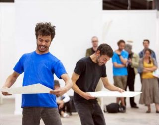 La main gauche est dans la main droite, les pouces se touchent. Puis index, majeurs, annulaires et auriculaires se rejoignent par leurs extrémités respectives et les mains forment une sphère. Dans cette performance, premier opus d’un cycle d’événements conçu à partir de l’expérience de pensée « la chambre chinoise » imaginée par le philosophe américain John Searle, deux personnages interprètent une séquence d’opérations symboliques et enchaînent les transpositions. Le mouvement se traduit d’une forme à une autre, et c’est l’expérience des transformations du cercle dans leurs résonances qui délimite la proposition. Le groupe EW travaille sur des formes transversales qui interrogent les interactions entre corps, espaces construits et technologies.