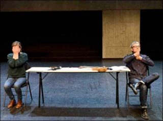 Louvoyer entre fiction et réalité, jouer de vrai pour y croire pour de faux (ou le contraire), épaissir les lignes de vie et de répliques de mille et une associations d’idées qui se précipitent dans la tête au moment où l’on parle et agit est l’un des sports préférés de Fanny de Chaillé et Pierre Alferi dans Répète. Avec toujours cette obsession clinique et ludique du mot, de son sens et de sa manière sonore, de sa galaxie sémantique, qui fait parfois presque passer le français pour une langue étrangère.