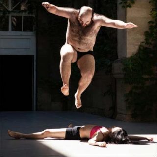Kaori Ito, le poids plume, titille quant à elle le géant, malaxe ses bourrelets, le caresse, le cajole, l’attaque. L’homme immense le lui rend bien, l’attrape au vol, la soulève ou la rejette d’une pichenette. A travers l’enlacement, l’enroulement, les pas de deux et les portés, Religieuse à la fraise célèbre les opposés. Au fil de la chorégraphie s’enchaînent les scénarios, l’improbable duo formant d’étranges figures polymorphes: monstre à deux têtes, corps à huit membres, siamois disproportionnés.