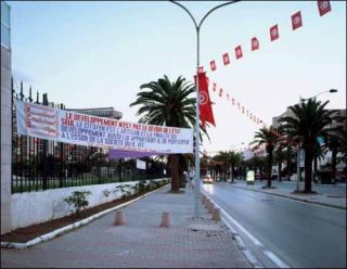 — Avenue Mohammed V pendant le Sommet Mondial sur la Société de l’Information, Tunis, 16-18 novembre 2005. Série «Sommet Mondial sur la Société de l’Information», Tunis. Tirage Ilfochrome contrecollé sur aluminium. 127,5 x 158,5 cm, édition 1/3