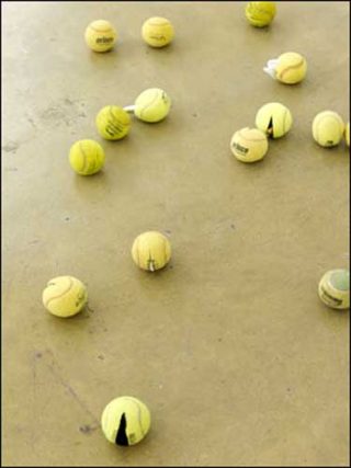 – Untitled, (tennis ball sculpture), 2008. 80 balles de tennis remplis avec divers objets. Dimensions variables. Version I