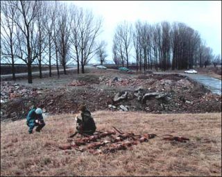 Aujourd’hui, de retour sur les lieux du vrai-faux charnier, ou dans les locaux de l’usine qui a vu naître l’insurrection roumaine, aucune trace de l’histoire n’est plus repérable. C’est, au contraire, à un recouvrement systématique d’une visibilité de la mémoire que Gilles Saussier est confronté: dans un retournement qui ne peut que susciter un sourire amer, le photographe est témoin d’un voyage de presse sur les lieux du charnier historique dorénavant invisible, à l’occasion duquel les journalistes sont invités à «jouer aux chasseurs de gibier sauvage».