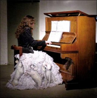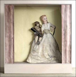 Attablé à un guéridon, face à un théâtre de poche vide, qui ressemble à s’y méprendre à la pièce exiguë dans laquelle se tiennent les musiciens du film projeté dans la mezzanine, dont les pyjamas, costumes de scène et «peaux de rêves», sont pendus dans un cabinet-coulisse jouxtant la scène reconstituée, et dont on a vu et entendu le jazz rock tenter d’insuffler son énergie débordante aux ondulations poussives d’une limace, grignotant ce qui se révélait être, après un élargissement du champ, une banale plante verte, posée sur le rebord d’une fenêtre; attablé au guéridon, donc, on peut lire, dans le catalogue, qui est, encore une fois dans cette programmation, une extension de l’installation, une histoire épique à rebondissements multiples, obtenue par collage de fragments d’un roman gothique de XVIIIe siècle, et illustrée, par les soins de l’artiste, de photographies prises dans sa maison de Bourgogne, où visiblement le film a été tourné, et sur lesquelles on reconnaît le mobilier, les aquarelles, les vitrines naturalistes, qui entourent le spectateur.