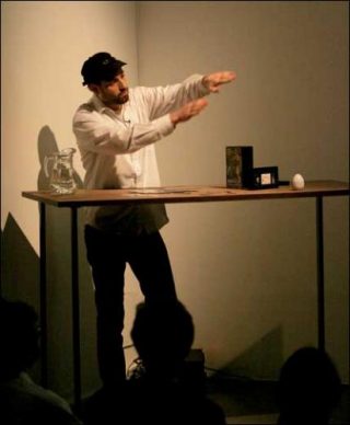 A l’exact inverse de l’œuvre de Vezzoli, entrer dans celle de Tris Vonna-Michell n’est pas chose aisée. L’installation présentée au Jeu de Paume n’exerce aucune séduction, au contraire, elle évoque un ramassis de rebuts, dans une tentative de mise en ordre quelque peu incertaine.