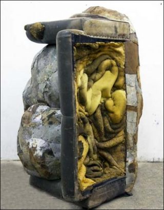 Issu d’une série autour de mobilier chiné, le Canapé expose quant à lui le passage du temps sur sa peau burinée et salie. On ne peut plus s’y asseoir, s’y reposer. Sa fonction est morte et annihilée. Il est devenu le symbole de l’irréversible accident.