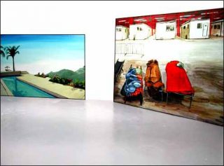 En s’appropriant les principes plastiques et les dispositifs techniques propres au dessin animé, Boris Achour nous invite à une promenade décalée à travers une série de sujets peints, découpés et plaqués sur un support en verre transparent, accompagnés de paysages-décors qui furent un jour peints mais qui sont ici présentés sous la forme d’impressions numériques de grand format montées sur châssis. Ces simulacres de diptyques fonctionnent par couples que l’on peut pourtant associer à notre guise, comme l’indique bien la mention «Un verre et un décor doivent être acquis ensemble quelque en soient leurs dimensions. Des formats différents peuvent être associés».
