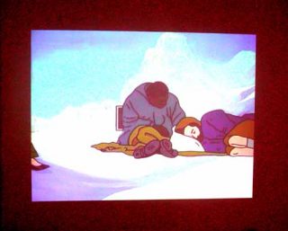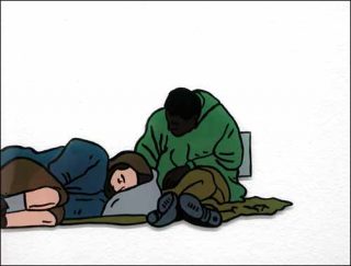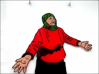 Un personnage au teint jaune nous fait un sourire débonnaire lorsqu’il est remplacé par un camion plein de cadavres que l’on décharge comme de vulgaires sacs de pommes de terre. La grand-mère tchétchène apparaît sur fond de piscine, et les SDF voient passer une paire de jambes qui ne se retourne pas sur eux. Construite sur un rythme non aléatoire, cette vidéo est à considérer comme une sorte d’anticipation anachronique de deux univers chaotiques, un anti-flash back, comme le révèle le titre de l’exposition.