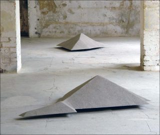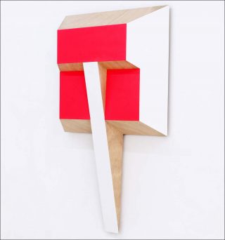 La sculpture murale en bois de Louidgi Betrame intitulée Cumbia del desierto, présente une forme abstraite mais si précise et symétrique qu’elle suggère un sens ou une utilité qui nous échappe. Il en est de même des sculptures de Simon Boudvin, Tectoedres 02 dont les formes et la teinte qui se confond avec le sol évoquent tour à tour des pyramides, des engins militaires ou des vaisseaux spatiaux. Par un procédé de condensation, ces œuvres amalgament formes et couleurs apparemment abstraites et un vocabulaire visuel qui renvoie à de multiples domaines concrets, engageant ainsi un glissement de l’abstraction vers la narration.