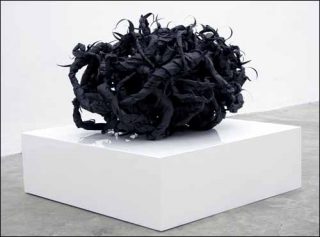 La sculpture en papier noir et blanc Hold, posée sur un socle blanc brillant, ressemble à une sorte de plante merveilleuse et alambiquée. L’ensemble paraît sorti des dessins. Comme si l’encre devenait cette sculpture noire, et le papier le socle, dans un passage sans heurts de la bidimensionalité à la tridimensionalité.