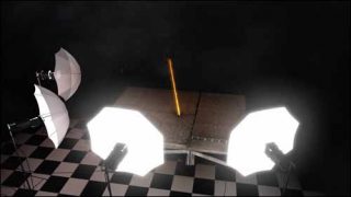 La vidéo en images de synthèse Spawn/Railgun, diffusée en boucle, rappelle les narrations qui introduisent les jeux vidéos. Notamment en raison de la «scène» mystérieuse dans laquelle une «caméra» tourne autour d’un rai de lumière orangé posé sur un socle. Le tout est entouré de sortes de parapluies de flash électroniques de photographes, posés sur un sol en damier noir et blanc.
