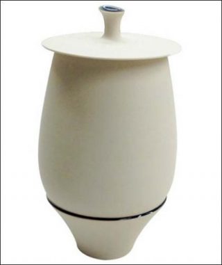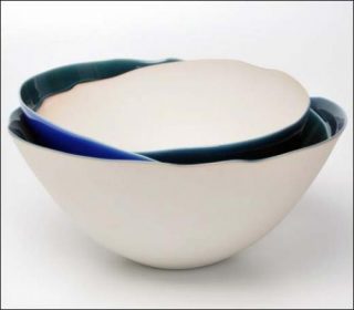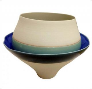 La céramiste japonaise Fukumoto Fuku compose des bouquets de porcelaine en superposant différents contenants, créant ainsi un équilibre subtil. Elle rehausse la pureté du blanc à l’aide d’une palette de glaçures bleues et de verts vifs.