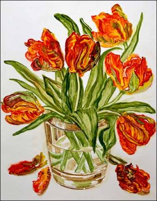 Non, car ses fleurs sont un Moi. Et leur texture épaisse, leurs contours prononcés et leurs couleurs flamboyantes ne relèvent absolument pas d’une esthétique classique. Les fleurs ne sont pas là pour elles-mêmes, elles expriment des moments forts de la vie de l’artiste. Avec leurs traits exagérés et leurs couleurs presque criardes, elles ne sont pas si loin des œuvres précédentes. Sauf que, cette fois, le Moi avance masqué. Au fil des trente tableaux exposés, il se disperse au travers de lys, roses, tulipes ou pivoines, fleurs isolées ou en bouquets. Il n’est donc plus livré en pâture. Il est à décoder. D’où les titres étranges des tableaux : Le sourire est incompatible avec la loi de la causalité. Drôle de titre pour un bouquet de fleurs ! Les fleurs isolées, peintes en petit format et sur fond noir, ont des titres de notions abstraites : Envie, Trouble, Vice ou Lassitude. Ou la triste rose tête basse, intitulée La Fleur des idées fixes.