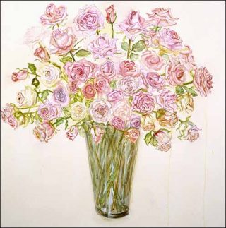 Les grands formats, réservés aux bouquets, sur fond beige, sont des réflexions : Ne pas voir dans les choses plus qu’il n’y a, par exemple, pour des bouquets vus en transparence au travers de vases. Ou encore ce bouquet de magnifiques roses — fanées —, dont les pétales se déposent délicatement au pied du vase. Il a pour titre Les Roses de mon père.
