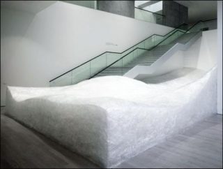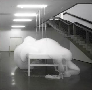 Le spectateur déambule autour de cette coulée blanche comme neige, constamment mouvante et changeante. Il perçoit ça et là , par transparence, des zones noires ou grises sur le fond sombre. La mousse se répand sur toute la largeur du plan incliné et envahit progressivement l’espace. Cette sculpture éphémère croît et disparaît simultanément. Au hasard des caprices d’un coup de vent, des morceaux de mousse peuvent se détacher et atterrir sur les tables du café. Ces fragments de mousse évoquent alors plus la douceur et la légèreté de la crème Chantilly que la masse compacte et menaçante d’un glacier ou d’une avalanche.