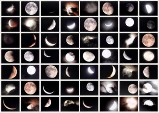 Nouveauté dans le travail de l’artiste : la série de photographies de lunes commencée en 2010, Albescent, et prises cette fois au numérique avec des temps d’exposition très courts. Non seulement Vera Lutter change de technique mais elle s’ouvre à la contemplation d’un phénomène naturel, loin de l’esthétique urbaine ou industrielle qui lui est chère. La lumière et son émergence de l’obscurité est toujours centrale. Cette fois-ci avec des touches de couleurs douces subtilement ordonnées dans le grand polyptique Moon Wall III. Mais c’est aussi le mouvement qu’elle capte alors, en nous faisant voir les changements d’états de l’astre lunaire et en les juxtaposant.