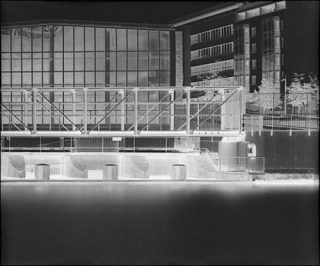 Si ces grands tirages uniques collent pour ainsi dire au réel, le résultat obtenu surprend toujours par son degré d’abstraction. Il y a d’abord l’effet de négatif qui transforme les zones claires en noir et les éléments sombres en blanche clarté. Puis il y a la pose longue qui fixe une durée sur une image unique. Tout ce qui se meut trop vite n’imprimera pas le papier, ou apparaîtra dans le flou, telle une présence fantomatique.