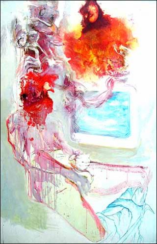 Dès l’entrée, nous remarquons le tableau de Pascal Pillard (L’Apprenti sorcier et la Grande faucheuse) représentant un homme se masturbant à côté d’un écran de télévision. Nous observons ce corps mi-vivant dont la tête disparaît dans une effusion de fumée rouge. Les autres peintures de l’artiste s’inscrivent dans ce registre du corps décharné, mélangeant des tons doux à des brouillons de sang, des aplats à des coulures.