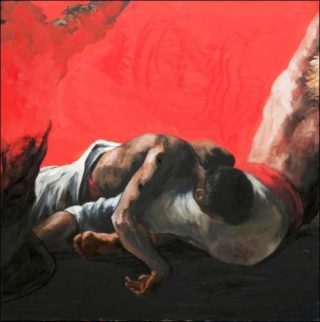 Ici, sur un rectangle d’un rouge irrégulier, se détache une main, figure de proue quasi immobile d’un avant-bras abandonné. Entre ombre et lumière, de ses cinq doigts solitaires, elle apostrophe celui qui passe, l’incitant à entrer. Là , un buste éreinté est en proie à des mouvements contraires. A la fois de chair et d’airain, des épaules fragiles redoublent d’efforts pour ne pas s’affaisser, tandis qu’un visage assoupi se laisse glisser vers un néant de lumière. Plus loin, des jambes s’agitent, vaine tentative d’échapper à l’attraction des couleurs sans fond qui les enserrent… A quel voyage ces corps fragmentés de Martin Bruneau sont-ils l’invitation?
