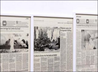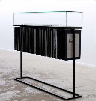 Ainsi, le régime d’apparition et de disparition des images semble s’inscrire au cœur même de la pratique d’Estefania Penafiel Loaiza, sans que son œuvre ne se départe de connotations sociales ou politiques. Par exemple, elle collecte dans Sans titre (figurants) des coupures de journaux où apparaissent des figures anonymes, et gomme leur image. Une présence blanche fantomatique émerge alors au milieu de l’article, prêtant paradoxalement plus de visibilité à ces anonymes qui peuplent le champ de l’image comme des figurants dans un plan cinématographique. Par là , l’artiste interroge les codes de représentation adoptés par les médias: comment représentent-ils visuellement des groupes sociaux donnés (notamment les migrants, les travailleurs, les pauvres) dans leurs colonnes? Ainsi, se pose la question de la représentation des masses dans les médias, ou de la traduction visuelle d’un terme générique (le peuple, l’ouvrier agricole, le travailleur migrant…). De plus, les résidus de gomme et de papier sont collectés dans des fioles numérotées renvoyant à la liste des médias dans lesquels l’artiste a pioché (Le Monde, Le Figaro, Libération, The New York Times, International Herald Tribune, etc.). Ces fioles nous font alors penser à des urnes funéraires remplies de cendres grises, renfermant le souvenir ou l’identité des figurants.