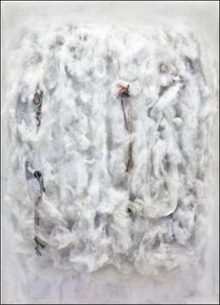 C’est une oeuvre assez contemplative: quand vous restez un moment devant elle, vous créez automatiquement des images mentales. Bien sûr, elle fait référence à Manzoni et à ses Achromes, mais ce qui la différencie, ce sont les quatre boutons colorés qui y étaient intégrés. Leurs fils colorés et entrelacés font penser au nerf optique. J’ai contrecollé le tout sur une planche de bois, tapissée de journaux du jour que j’ai au préalable badigeonnés de peinture. Tout cela pour donner une sorte de rumeur du monde à cette pièce, que je considère principalement liée à la projection du regard.