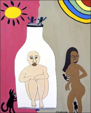 Quant à la couleur, elle se fait, tour à tour, caresse, expression subtile d’un sentiment ou présage d’un danger potentiel. De la jovialité insouciante au drame il n’y a qu’un pas comme en atteste Man in Bottle. Un homme, dont le visage exprime une touchante perplexité, est emprisonné dans une bouteille. A l’extérieur, une créature des îles, dans une attitude racoleuse, inspecte les environs tandis que le soleil brille et l’arc-en-ciel déploie ses couleurs chatoyantes.